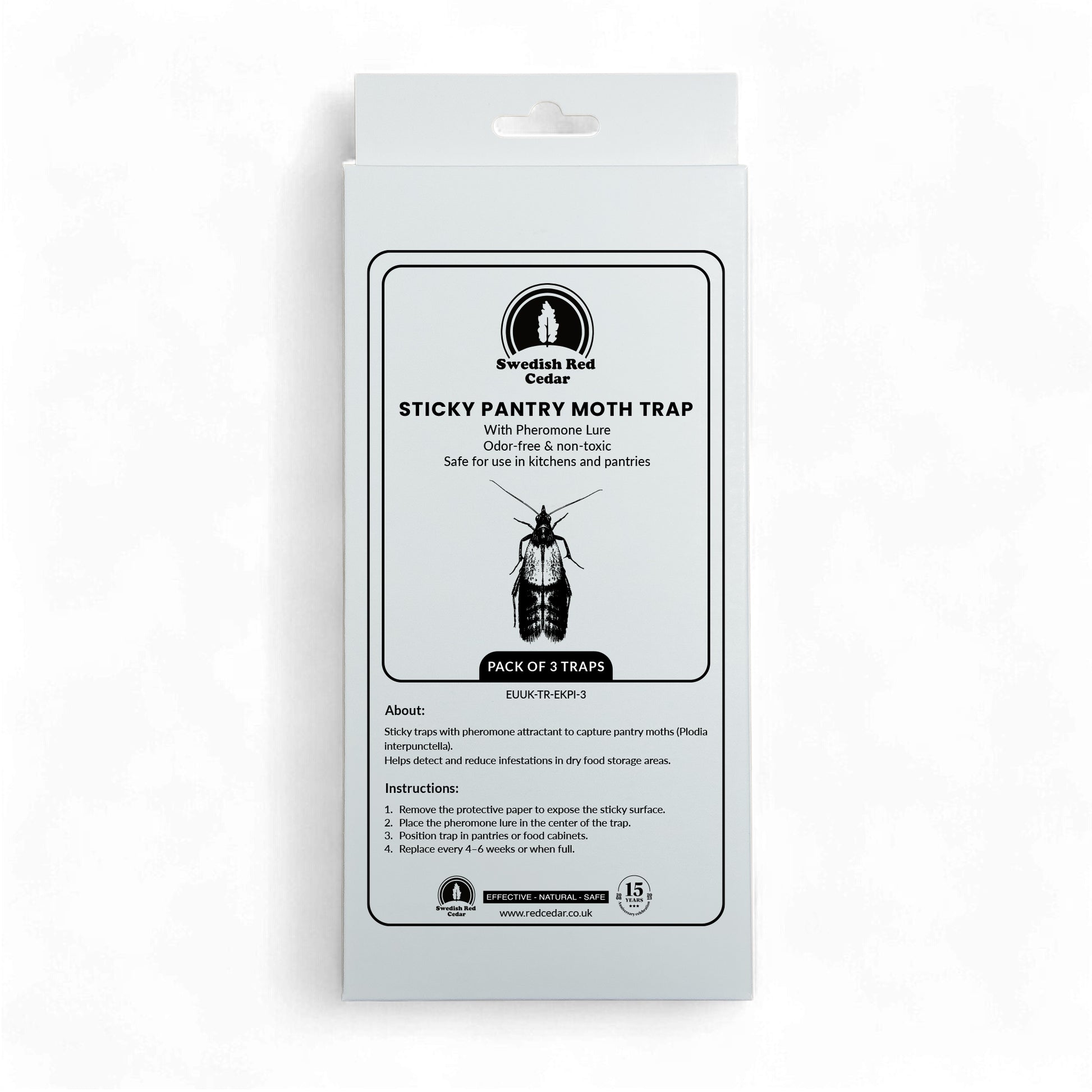 This sticky trap for pantry moths is completely non-toxic and can be placed in kitchen cabinets and on kitchen counters to prevent the presence of pantry moths in your kitchen. When the males land on the surfaces, they get stuck in the glue that is in the trap. The females then have no males to reproduce with and your home will quickly be completely moth free. The addition of Pantry Moth pheromones creates a sphere of scent that is impossible for humans to notice, but that attracts moths to the trap.